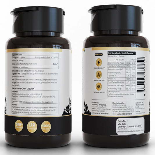 Himalayan Pure Shilajit Capsules | 450 mg | 60 Veg Capsules | ISO, GMP Certified | Energy & Vitality Booster